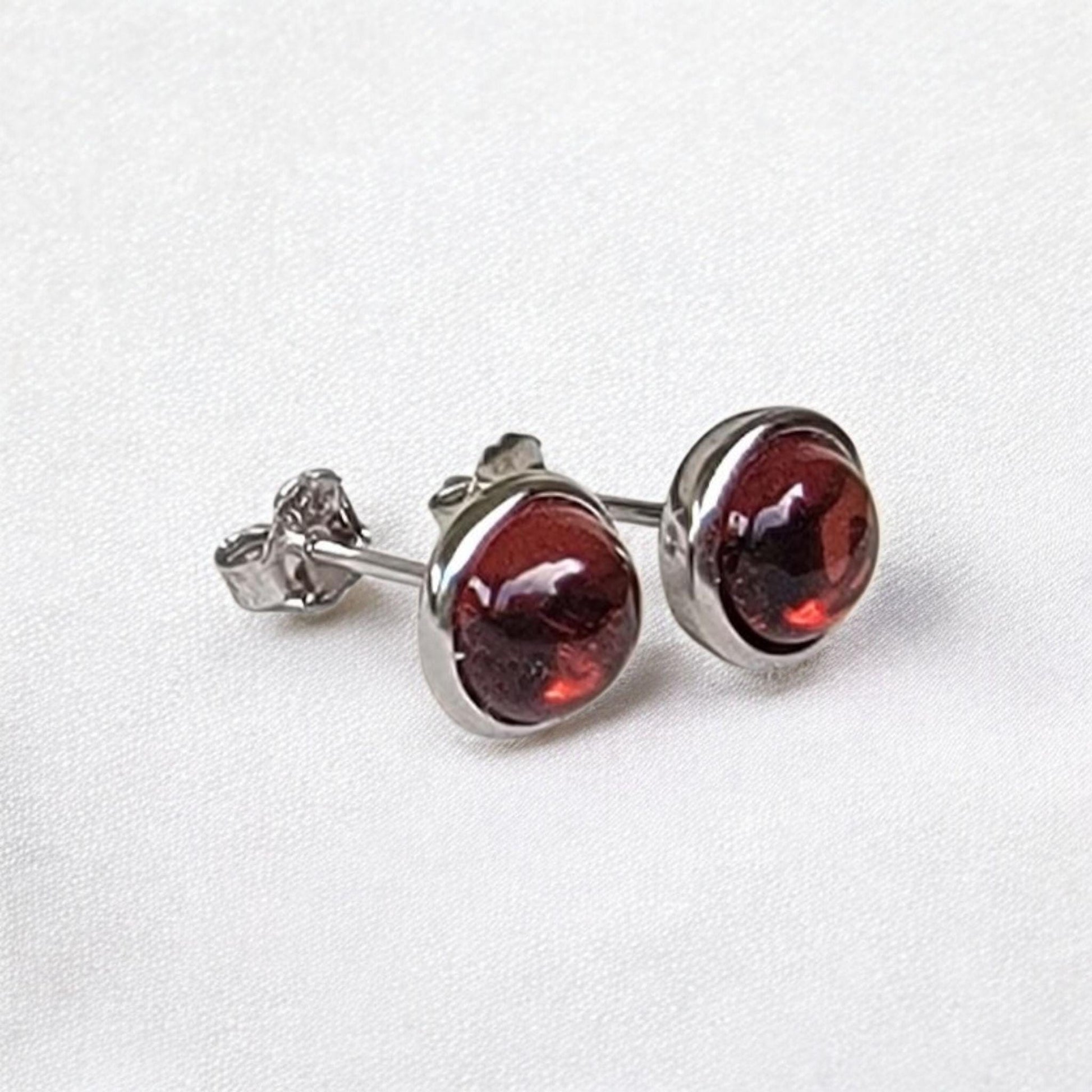 925 Sterling Silver Garnet Stud Earrings - Bezeled Garnet Jewelry - Medium Large Garnet Stone 6mm 8mm