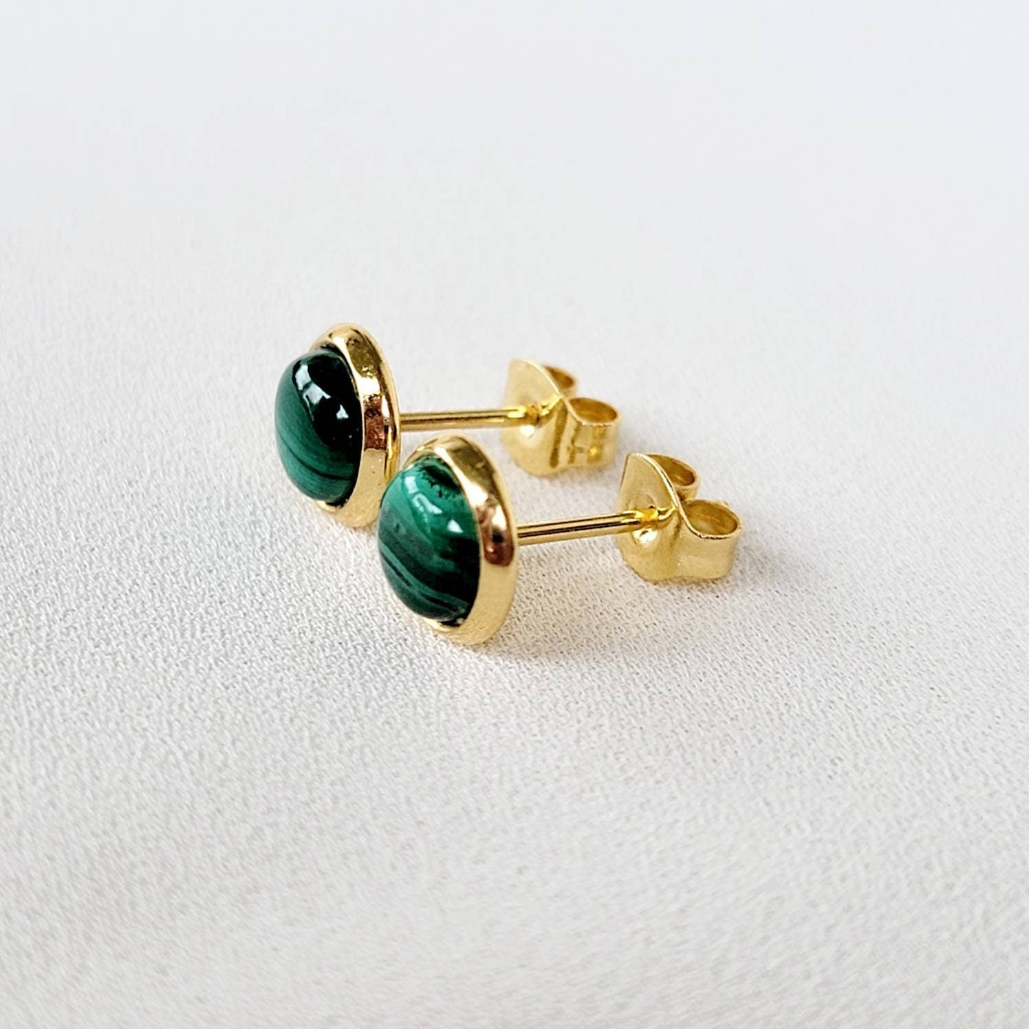 - Two 6mm genuine malachite stones framed by an 8mm gold stainless steel setting for lasting durability and shine
